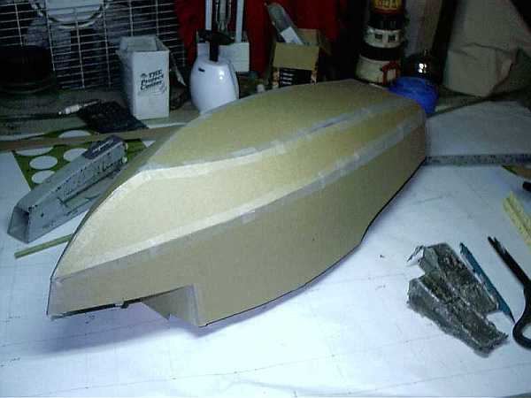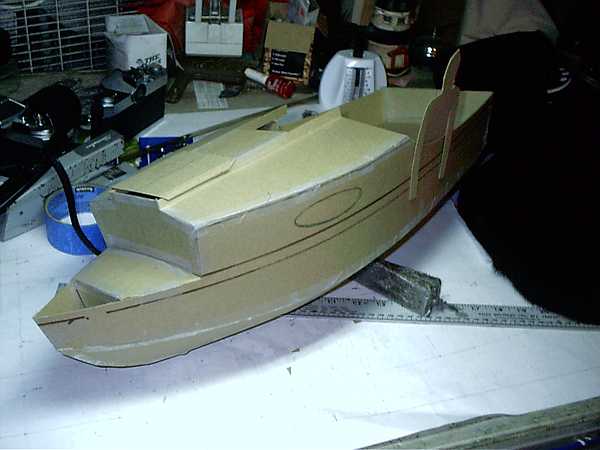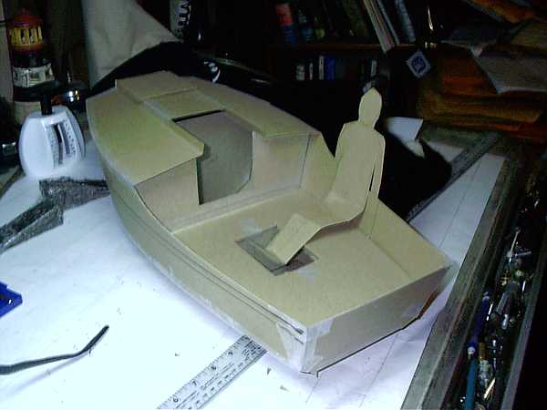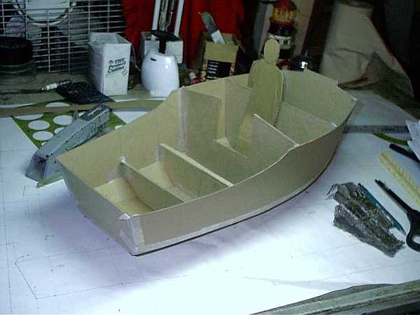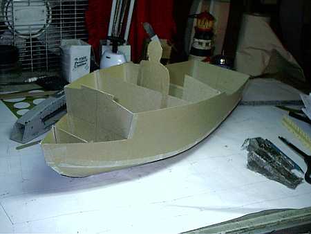 Anyway, I figured the shapes of all the panels in 1/8 scale, made card copies of the panels and taped them together. An important step because if the model don't fit then the real boat don't fit. OK, here are three pics with the decks still off. First bow shot: