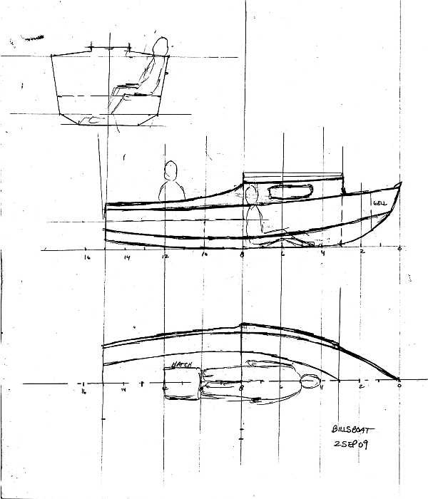 ... in the past because I found them for all practical purposes "impossible". I'd tried it several times but here was the basic problem. You start with a 15' long hull and put two or three adults on it, sitting on a watertight deck two feet above the bottom. Let's say you figure 600 pounds for the crew and another 600 pounds for the basic boat and the usual sailrig. When you try to balance the thing to selfright from a 90 degree knockdown you need another 500 or 600 pounds of ballast in the belly and your little boat is approaching a ton in loaded displacement. Now, a 15' hull will have to float quite deep to float that much weight. Micro got away with it with about 450 pounds of lead in a keel about a foot below the boat's bottom, plus a 6' beam with hard chines, a totally flat bottom. When I think back about Micro I feel Phil Bolger must have gone down the dead end road a few times like I did with trying to get the little cruiser to do the job without strange proportions or a down low keel. But in the end he made it work in about the only way it could and it is a fine boat.