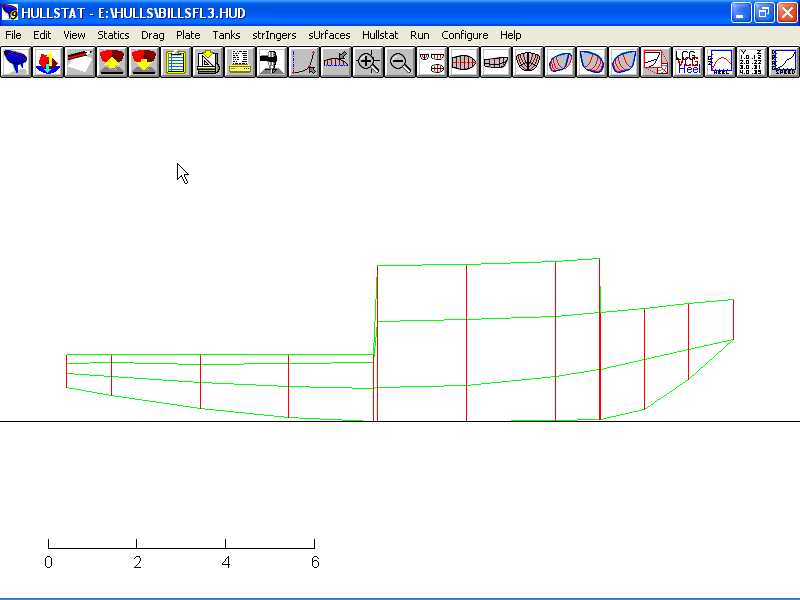 Hullform is a really smart program. I have no idea how it works but it works very quickly on any computer and I've never caught it trying to tell me a lie. So it tells me that this shape will displace 700 pounds at 5.7" draft, 1000 pounds at 7", 1200 pounds at 8", and 1400 pounds at 9". So my quicky guess was only off by 50 pounds. So the single skipper scene will draw 8" and the party boat scene just over 9". In real life add about 3" to those numbers since we are going to have a center skid with some lead hanging on it.