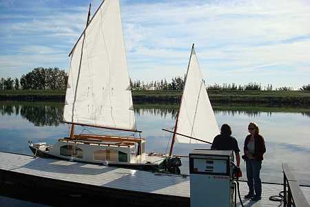 These boats have proven to be good for sail rig tinkerers (be sure to read and apply the Sail Area Math essay before starting). Here I am in Piccup with a polytarp sharpie sprit sail. The rig is different from the originals but the hull here is totally unchanged (except for paint) from the original shown on the beach at Pensacola.