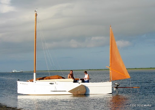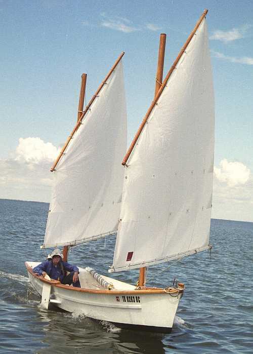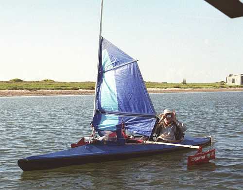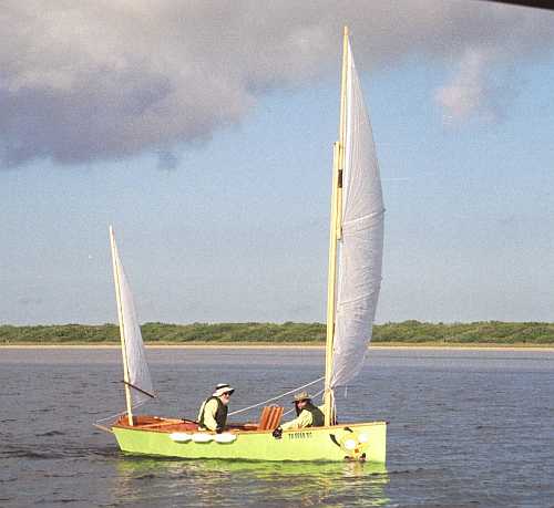 This is Ted Arkey's Jukebox2 down in Sydney. Shown with the "ketchooner" rig, featuring his own polytarp sails, that is shown on the plans. Should have a sailing report soon.