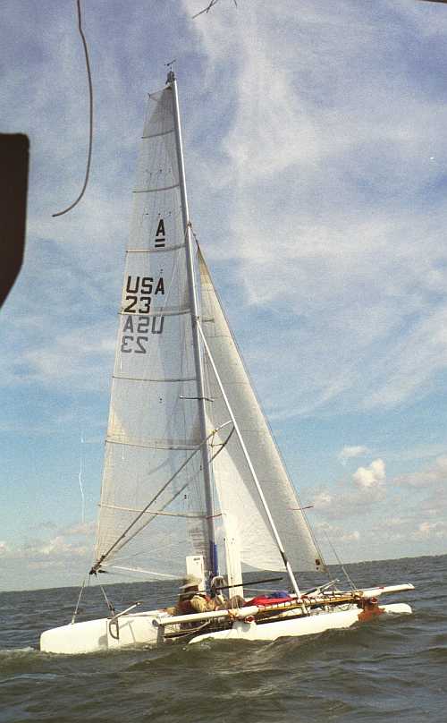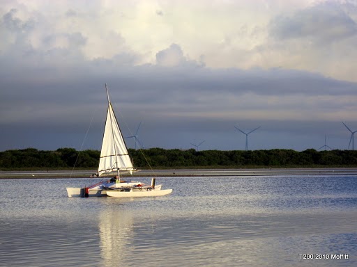 Loren is a true Frenchman working in Houston. This is his proa. Designed and built by himself. Looks like glass but inside it is strip planked wood. A 20' hull with a 31' mast and sail stolen from a racing catamaran. I suppose this was easily the fastest boat on the cruise. He left well after us, passed us, and I'm told was first to the yacht club. Well, almost. Andrew Linn said Loren flew by Andrew's Laguna into first place and was faced with sailing to windward up the twisty narrow shallow channel to the yacht club in a boat that doesn't tack. Instead it "shunts" as proas do. That tedium allowed Andrew to pass Loren in the entrance and be first to the club house. Well, Loren will be first to admit he needs to practice the maneuver. And maybe shorten the rig and get a longer hull. But it is quite a gadget, isn't it? From the spectator's viewpoint a proa looks like a simplification...just a canoe with a rig and a single simple float and rudder. But in practice it looks to get away from you needing two rudders, two daggerboards here, and a rig that is limited by having to work in both directions. Anyway, it was a spectacle! Here is another view as he whizzed past us....