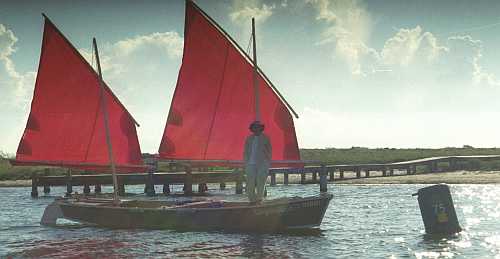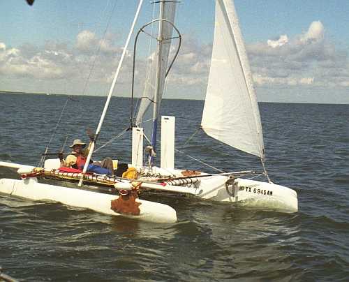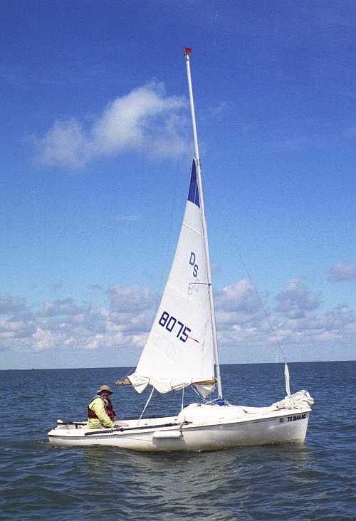 When I was in Port Mansfield everyone was talking about John Wright. Was he their guru, I thought? Andrew Linn calls him Saint John. He looked like the "Old Man" of the sea a lot more than Spencer Tracy ever did. He had assembled his modified Laguna for the first time at Port Mansfield and gotten off late there so we had not seen him on the first day. He must have gotten off later at Haps Cut too but half way through the day he came slicing past the Caprice and I got to see him in action for the first time. Not that he was doing much at the time besides sitting down and going fast. I suspect that roll beside him is a staysail which I did not see him use. But clearly he had it in high gear and on cruise control.