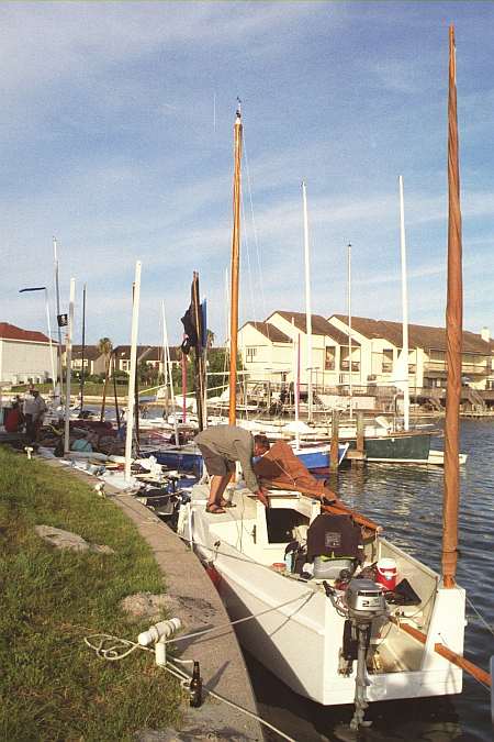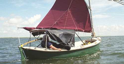 Here is a Mudhen fitted out for the trip. I think this fellow was Donovan and he grew up in the area and cleary understood the situation with the sun. He has a little bimini with the side flap like Chuck's.