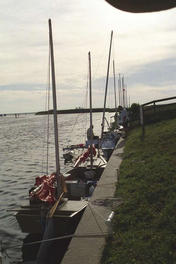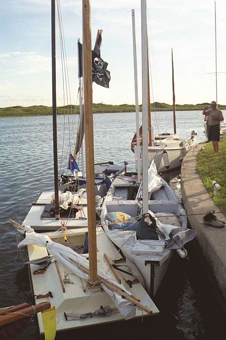 I guess here you see the smallest to the largest. The big factory boat had rotating masts with wishbone booms and he reefed and furled his sails by turning the masts and rolling up the sails. Then there are two Lagunas, looks like Gordo Barcom's and Mike Monies', then the Pelican and then a piece of one of the PDR pirates.
