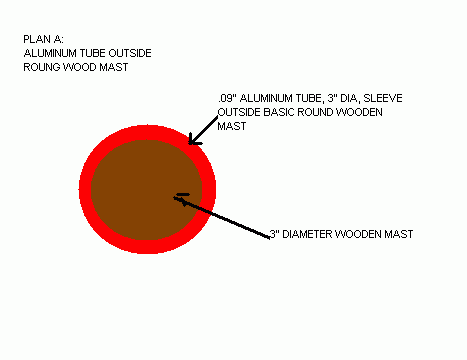 Ok, maybe the skipper is getting a little worried. He has a bunch of fat people on board for the first time and has stability he has never imagined before. The wind is picking up and he is in a position to "blow the sticks off" as they used to say. When he gets home he slides an aluminum tube over say the bottom 4' of the mast such that it extends from the step to a foot or two above the mast partner. It is a sliding fit, not glued or fastened so that the two pieces are locked together. But the fit is good enough that the wood and tube must bend together. They will share the load.