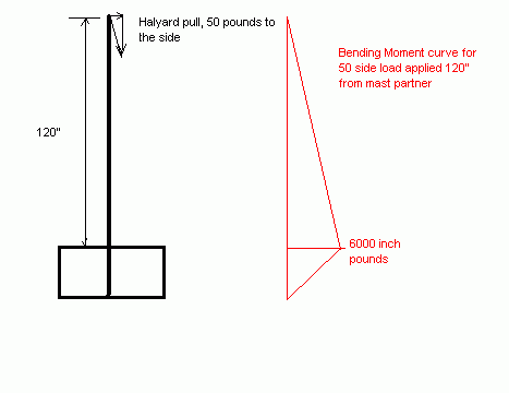Let's say we have 50 pounds of sail side force at the mast tip being dumped there by the halyard which gets it from the yard which is tied to the sail, etc. Let's say we have 10' of mast from tip to mast partner. Then we would have 10 x 50 = 500 ft pounds of bending at the mast partner. Let's call that 500x12=6000 inch pounds.