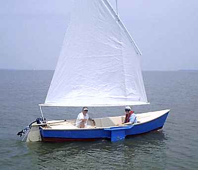 This is Ted Arkey's Jukebox2 down in Sydney. Shown with the "ketchooner" rig, featuring his own polytarp sails, that is shown on the plans. Should have a sailing report soon.
