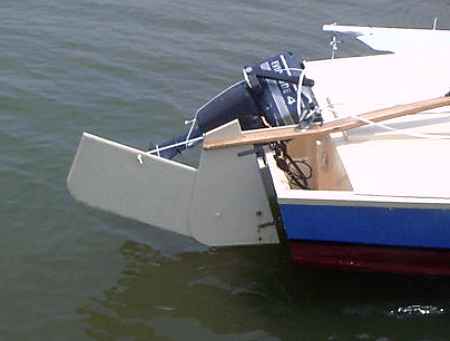 The motor well is an open self draining well that uses the full width and depth of the stern. It will come in handy for storing wet muddy things you don't want inside the boat, like boots and anchors. I've suggested in the plans that the rudder can be offset to one side a bit to give more room for the motor. We did not use George's little Evinrude since the boat sailed easily in all directions, but George says the sidebyside sharing on the stern of the motor and rudder works fine. There was no interference with the rudder. (As with any outboard on any sailboat, the motor has a desire to grab the sheet with each tack so you usually have to tend the sheet a bit.)