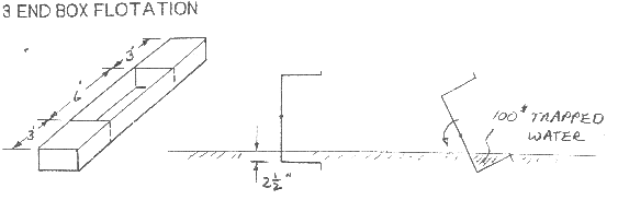 Next try an improvement. Figure 3 shows the boat fitted with water tight air boxes in each end, each 3' long such that only half the boat is open. We'll assume the weight stays at 100 pounds.