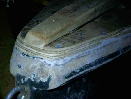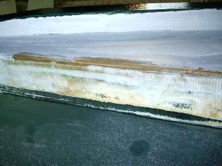 You can see the new plywood layer. You can see the original chine with original glass ground just enough to remove the original paint. In between those you will see a green line which is the painted radius of the original bottom. The new bottom now overhangs it a bit. I filled that old radius with Bondo and ground it smooth and added a quick new radius on the new plywood. Like this: