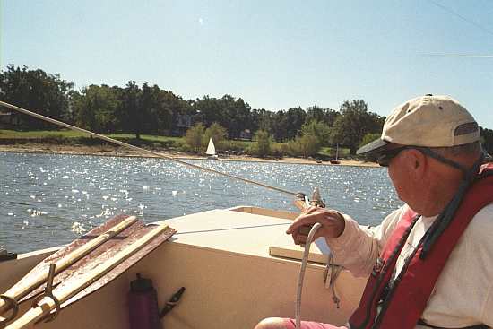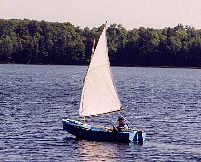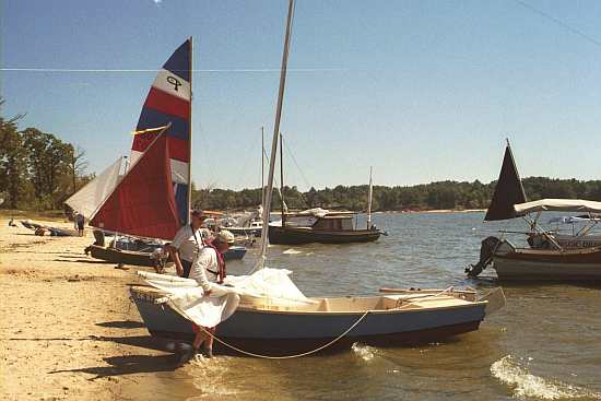 These boats have proven to be good for sail rig tinkerers (be sure to read and apply the Sail Area Math essay before starting). Here I am in Piccup with a polytarp sharpie sprit sail. The rig is different from the originals but the hull here is totally unchanged (except for paint) from the original shown on the beach at Pensacola.