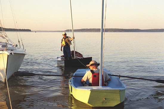 Well, the wind failed totally as the sun was setting. Mike has a Boston Whaler with 30 hp and used it to gather up the becalmed. But there were others who paddled and rowed in. Here is Stan in another Piccup Pram pulling Chuck in the Welford PDR. Two Piccups together at the same meet! Never happened before, I think.