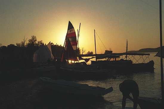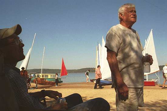 It was downwind and the wind was rising a bit so off we went. I hitched a ride with George Fulk on his Mayfly16. (Hey, George was working in the Peace Corp in Chile when they had the big revolution/military coup but luckily he didn't "disappear" like some of his fellows...)