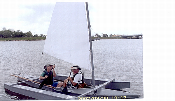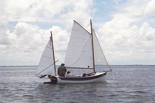 This is Ted Arkey's Jukebox2 down in Sydney. Shown with the "ketchooner" rig, featuring his own polytarp sails, that is shown on the plans. Should have a sailing report soon.