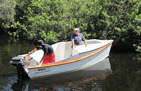 The prototype Twister gets a test sail with three grown men, a big dog and and big motor with its lower unit down. Hmmmmm.....