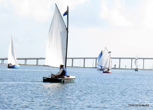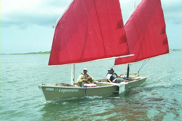 It's Gordo in his Laguna, this time with crew. They also are churning along. By the way, the Laguna crews mostly had polytarp sails and they looked good, went fast, and never broke. I'm glad polytarp sail technology has gotten to this point, where a fellow can make good sails on the cheap.