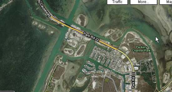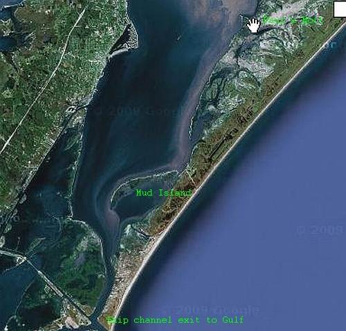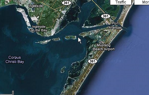 ...There are several ways to go on once past the big bridge and the fleet fractured. Almost everyone is heading down the ditch to the big, I mean REALLY BIG, ship channel that runs from Aransas Pass to industrial areas on the mainland at Corpus Christi. But not everyone since a few are always searching for the mythical shallow water short cut. Here is a google eye view of the ship channel...