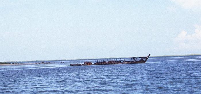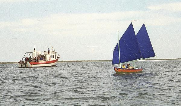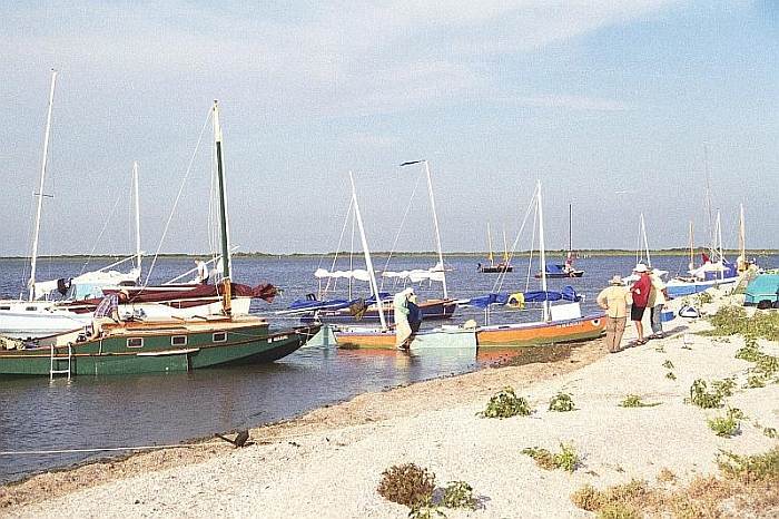 That's the tip of Mud Island behind the wreck. I should say that the adventurers of the fleet, the Laguna of Gordo and the pink Laguna with Sean and Tom on board, decided to find the mythical shallow water shortcut that appears in photos and charts between Mud Island and the barrier island. But the path between islands turned out to be well hidden and some exploring needed to find it. The gallant crews, who were well ahead of us when they started for the short cut, were well behind us after they passed through it. Next year they will have it in the memory bank.
