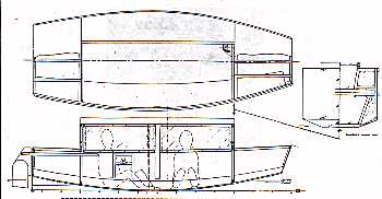 IMB has an 8' long cabin on a multichine pram hull. The prototype was built to perfection by Gerry Scott of Cleveland, Texas. At the Conroe (Houston) messabout I got a chance to look over his boat plus the only other IMB I know of built by Bob Williams. Both boats were quite true to the plans. Both had added low inside seats which made them more pleasant to use to the point that I will show some seats on the plans. I was worried when I drew IMB that the headroom would be minimal so drew no seats thinking the crew would sit on the floor, as with the original Birdwatcher.