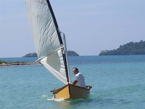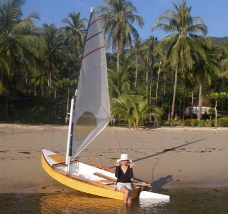 Attached are some pictures from building and sailing Mixer.Started building in Nov.2009 and finished in March 2010. In Thailand localy manufactured exterior plywood is of good quality but heavy( Keruing wood is used).For the bottom I used 7 mm (35 lbs ! )but for everything else on the hull I used 5mm(22 lbs ! )and the wood for framing the transom and side framing the bulkheads is red cedar(not western).Did not glass the bottom. Mixer completely stripped and ready to put on the car roof weighs exactly 100 lbs. I finished all the spars for a balanced lug but then I built a stub mast(60mm square cross section) and use my old windsurf sails on a bamboo spar which is pulled up to the stub mast through a 2 to 1 purchase.Works rather well. Drawback is no reefing possibility and have to lower the sails and change to a smaller one (have 5 sails from 45sqft to 67sqft).The seats which are demountable make the boat much more comfortable and give you the possibility to outride a little bit.I think Mixer is more stable than you expect and standing up and going around feels safe to me(I weigh 160lbs and my wife 98).I like that Boat.