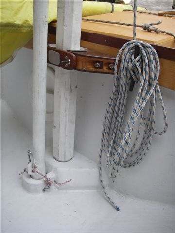 -The block lashed at the wind surf mast should be a little bit above the top of the stub mast. Then the halyard holds the windsurf mast down in its mast foot.