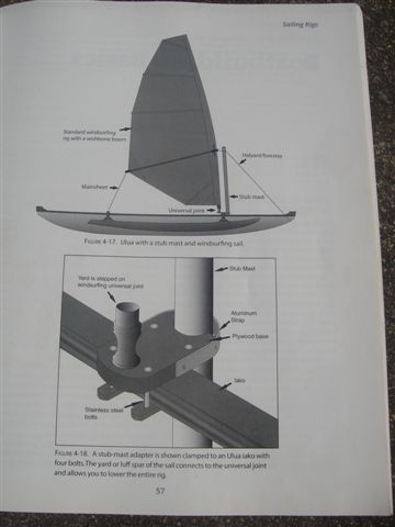 ... some traditional rigs that are similar. I suppose the Gunter rig is related and maybe the Solent lug rig too. He sent this copy from "Gary Dierkings book "Building Outrigger Sailing Canoes" showing the set up with original mast,boom and universal joint".