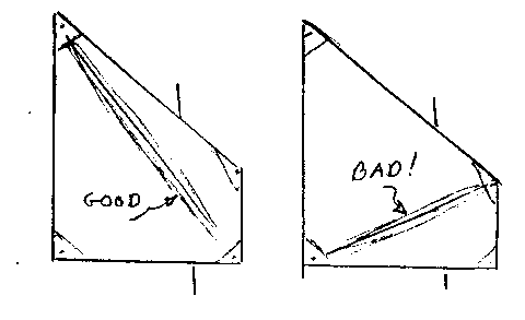 Here is some advice about how much to tension the tack line. It varies with wind strength. Look at the sail as you do it. See Figure 6. As you tension the sail with the force of the wind in the sail, stress folds called girts will appear in the sail. If the girt runs from throat to clew you need more tension. If the girt runs from head to tack you either have it right or can reduce the tension. A perfect setting will have no girts. Usually at the initial setup I put in a good girt from peak to tack. Then I watch it while sailing to see if that girt disappears. Then when convenient I trim as required. Remember that changing sailing conditions will change the tension requirements.