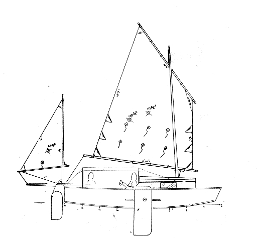 This is Ted Arkey's Jukebox2 down in Sydney. Shown with the "ketchooner" rig, featuring his own polytarp sails, that is shown on the plans. Should have a sailing report soon.