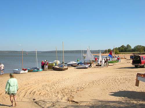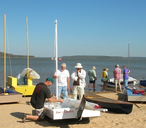 This was an interesting day for me. After the morning feed Mike Monies introduced me to his Catbox project. It was complete right down to its Indy500 paint scheme, each checkered flag block lovingly masked. Such a job! But he had never rigged it. He had all the parts and sort of told me it was my job from there on. What to do? Catbox has a lateen rig copied from the Sunfish design, in fact the idea was that you might steal a Sunfish rig from somewhere and go sailing with it on your Catbox. Well, I'd never rigged a lateen from scratch and I suppose my blueprints don't help a fellow much there. But with hardware, drill, and lots of line Paul and I muddled through and in an hour or two had it looking like it ought to be OK. We loaded it all into the back of Mike's pickup truck and thence down to the beach. More boats had arrived by now. But the scene looked like this in the morning.