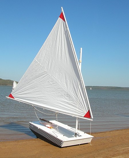 These boats have proven to be good for sail rig tinkerers (be sure to read and apply the Sail Area Math essay before starting). Here I am in Piccup with a polytarp sharpie sprit sail. The rig is different from the originals but the hull here is totally unchanged (except for paint) from the original shown on the beach at Pensacola.