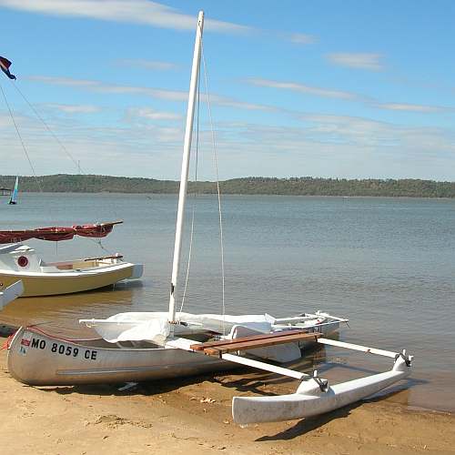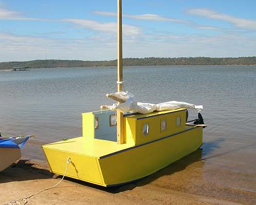 Here is an aluminum canoe modified to sail. It had a large lug sail. Normally I don't encourage this sort of boat but this one went quite well, I'll admit. It's not a proa in that it tacks instead of shunts...