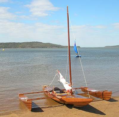 This is Ted Arkey's Jukebox2 down in Sydney. Shown with the "ketchooner" rig, featuring his own polytarp sails, that is shown on the plans. Should have a sailing report soon.