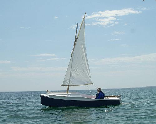 This Toon2 is also said to be a fine sailor. Compared to the stock sharpie sprit sail I would expect it to sail not so close to the wind. On the other hand it will certainly be easier to tow and set up and easier to reef and maybe be as good or better on the other points of sail. It's all the usual tradeoff. Note that it is not really a large boat and that the weight of the skipper in the stern affects the trim quite a bit. So with fine tuning she will be faster and better all around with the weight more forward. Then again, for lazing around on a slow day I found with my Piccup Pram that trim was not that critical and if the skipper lounged comfortably against the aft bulkhead, it looked bad but it sailed good. On its maiden voyage Mark's Toon2 was cruising all well with a Frolic2 and a Wooboto.