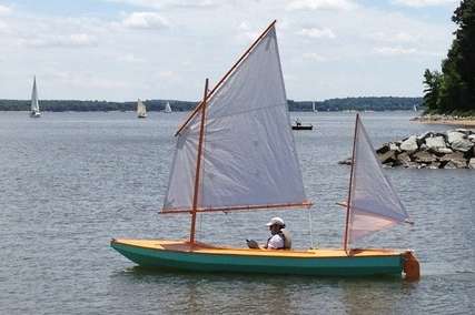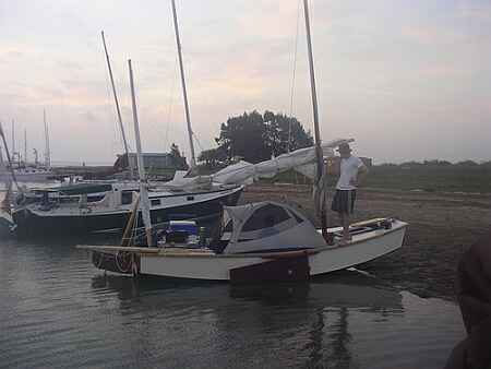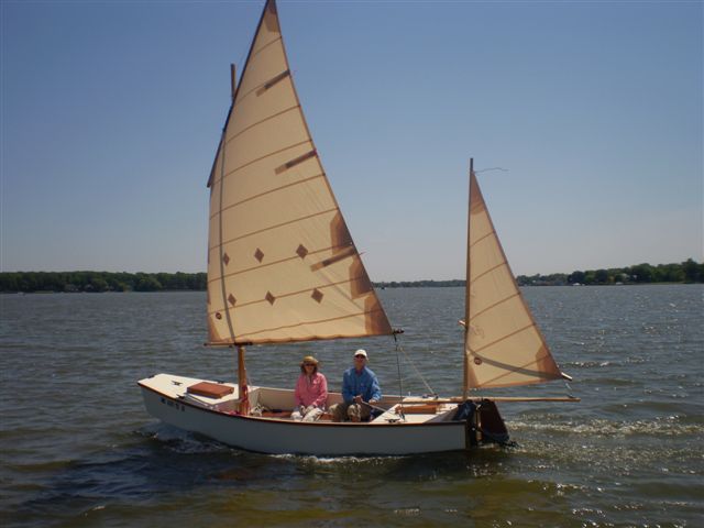 I dunno if Mike ever built his boat but Bill Moffitt in Atlanta made one to run the Texas200. He is an experienced builder and sailor and made a thorough job of it in a big rush towards the end. Launching at the Texas200 was its first time in the water. His wife sewed the sails the day before he left for the cruise, and this was her first set of sails! The sail rig he wanted was a lug main with a sharpie mizzen. I drew those up for him and they are now included in the plan set. Here is his boat under sail: