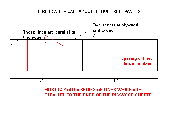 You have a few options now. You can go ahead and draw in all the bulkheads, etc., everything that you can before you cut out the hull panels that you have just layed out. (You won't be able draw in the last "cut to fit" items such as the decks and bottom panels in some cases. ) Or you can cut out the major panels and then lay out the remaining parts on the remaining plywood pieces. Either way is OK.