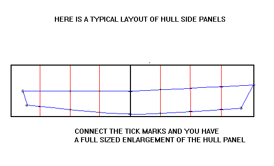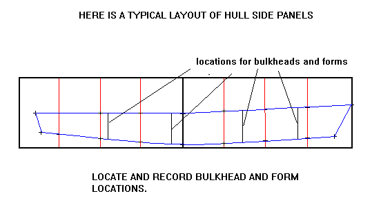 There is one last important step in laying out most hull panels. Many also must have the location of the bulkheads and forms drawn in. Locate them as shown on the plans and draw the locations boldly on the panel layout, like this: