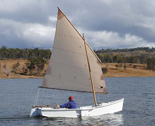This is Ted Arkey's Jukebox2 down in Sydney. Shown with the "ketchooner" rig, featuring his own polytarp sails, that is shown on the plans. Should have a sailing report soon.