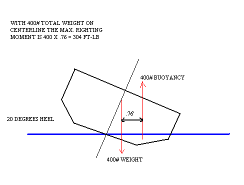 Now let's take the perhaps more common condition of the skipper sitting to windward on the bench seat. Not exactly hiking in any extreme way, just sitting on the bench on the windward side. In this example I will assume the boat weighs 200# and the crew weighs 200 # sitting to windward like this: