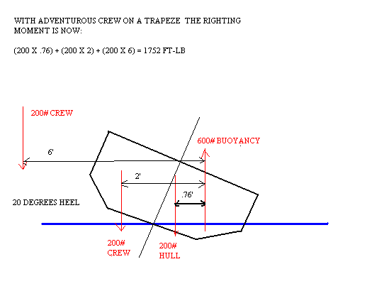 Now the righting moment is all the way up to 952 ft-lb. Sail load required to capsize the boat is now 952/9 = 106 lbs which is 106/74 = 1.4 psf for this 74 sq ft sail. That happens at about 17 knots. Now the wind is really starting to blow! Your adventurous pal says, "No problem." and grabs a rope leading to the masthead and steps out on the rail with a trapeze, like this:
