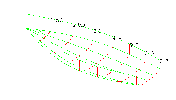 We can write the basic balance as the sail force S = W x D / L where W x D is the "righting moment" of the hull and D is the distance between the center of the sail area and the center of the leeboard (or keel or centerboard, etc.) area. W is the total weight of the boat with everything on board. L is often called the "righting arm" and changes as the boat rolls and is fairly difficult and tedious to calculate. But the free program Hullforms can handle it. To use Hullforms one must first model the hull in three dimensions. In the last issue we showed the model for Picara but this essay will focus on smaller boats. This is my Hullforms model of the 14' boat Ladybug:
