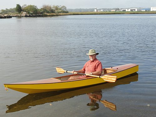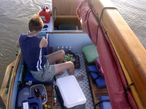Ladybug's hull has the layout I like the best - a 6-1/2' cockpit between two storage/buoyancy boxes. It would be a great solo camping boat. The buoyant wooden spars prevent it from turning turtle. You bring it upright with weight on the lowered leeboard. Then you must climb back on board and a slot in the rudder seems to be the best boarding ladder around, bringing your weight back on board where it least affects the boat. You will have to bail some water.
