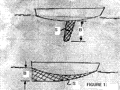 This sort of analysis flies in the face of some designs. As mentioned earlier, the shallow keel can work very well if given enough area. But I've seen designs with "keel runners" or "chine runners" which I think are just small projections off the bottom. Given what we have seen here I don't see how they can work effectively. I've sailed boats with skids and external chines which approach those things but my boats always had leeboards or centerboards too. If you think the skids and chine runners are effective, you need only take one of my boats out, get close hauled, and raise the leeboard or centerboard to see what happens. You'll slide right off! I don't think those shallow keel and chine runners are effective. (I'd really like to try or see a good test on Matt Leyden's Paradox. That boat has chine projections and nothing else. MAIB ran an excellent series about making a Paradox but, after years now, no test results. My own feeling is that everything about Paradox is optomized for downwind sailing, something the designer is expert at. I'm not making fun of him - few of us have the patience, experience, smarts, and knowledge to do what Matt has done. But I'm not sure if the builders are aware of what Paradox's limitations might be as far as sailing to windward goes. At any rate, it seems to me that Paradox could be given a more weatherly rig pretty easily with an effective pivoting leeboard and a more balanced lug rig. This essay was originally written in 1998 and now in 2012 I've still not seen a chine runner sailing boat in action.)