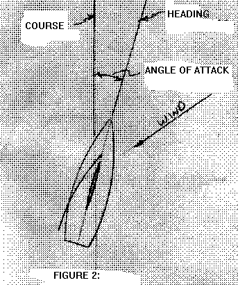 Next, for a board with a symmetrical cross section (so it can function equally on all tacks), the board must go through the water at an "angle of attack" to generate force, as we discussed in the last issue. Figure 2 shows how the situation applies to a close hauled sail boat. The skipper wants to go to on a certain couse but because of the angle of attack required by the board he must head his boat upwind by the angle of attack. So he might think the boat is "slipping" and producing "leeway" equal to the angle of attack. One other important thing to notice here is that any angle of attack of the underwater board must subtract from the angle of attack of the sails. A bad situation. Sort of a double penalty.