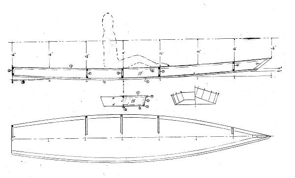 Three sheets of 1/4" plywood with the chines done with taped seams. I have it drawn for jigless construction but you might not get away with that since the sides will be so thin and limber. Thus I have also shown some dimensions to a "base line" so you could set up the initial construction on a ladder frame to hold it all true until the bottom is on.