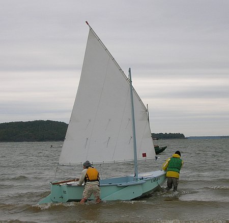 These boats have proven to be good for sail rig tinkerers (be sure to read and apply the Sail Area Math essay before starting). Here I am in Piccup with a polytarp sharpie sprit sail. The rig is different from the originals but the hull here is totally unchanged (except for paint) from the original shown on the beach at Pensacola.