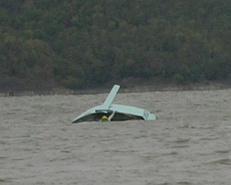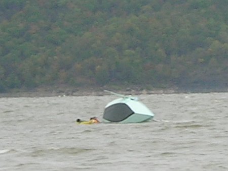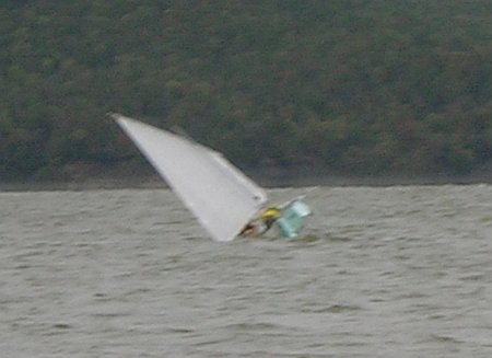 It nearly turtled, which surprised me since the lug rigged boats I tested long ago never would turtle because the buoyancy of the wooden yard would hold them sideways. It might have gone full turtle since it was felt the mast had struck bottom preventing that...