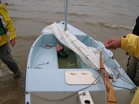 Next, give a lot of thought to how to right the hull. Normally you would step on a lateral board of some sort like a keel, but it might not be accessable to you for several reasons. It might be retracted at the time or too high out of the water for grabbing. So you really need something else and he suggested lines tied securely, and to hefty fastenings, on each side of the boat, clipped under the wale, that can be grabbed and used to pull the boat upright. He suggested securing the ropes with clips made of slitted pvc pipe that would secure the rope in normal use, but would easily release the rope when it is tugged. So that is one detail to think about.