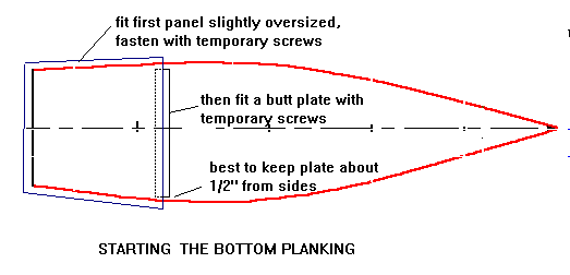 Where you start with the first panel is not too critical. Usually the plans will show you where to start. Let's say you have a 15' boat and the plans show to start planking the bottom with a 4' long piece at the stern. I would hoist the piece into position and clamp it in place long enough to track the hull shape on it. Then remove it and cut to shape well outside of the traced line. Put it back in place with temporary screws or clamps.