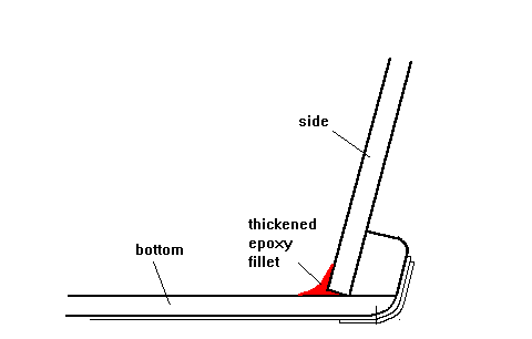 With the boat upright and forms removed, you should add a fillet of thickened epoxy around all the interior joints like this: